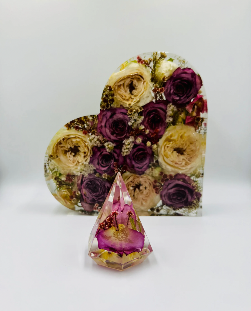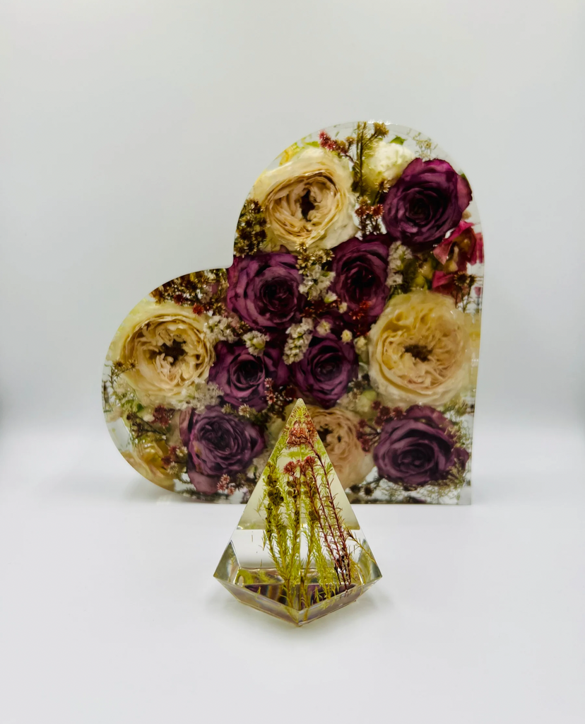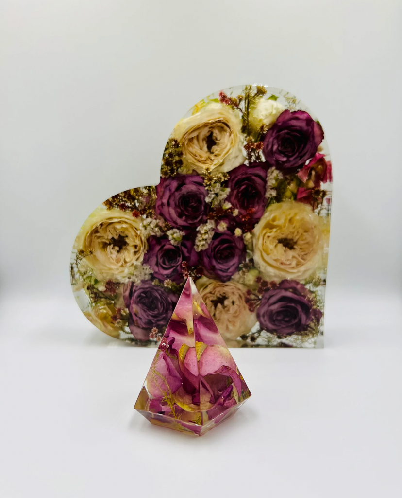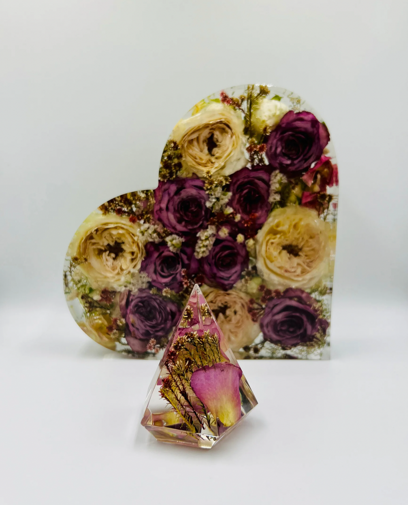 Megőriznéd a menyasszonyi csokrod virágait és azt szeretnéd, hogy olyanok maradjanak, mint amilyenek voltak az esküvőtök napján? Válaszd a legmodernebb virágtartósítási módszert, aminek köszönhetően a virágaid a legszebb formájukban maradhatnak veled! Egy speciális szárítási technikának köszönhetően a növények színe és formája nem, vagy csak minimálisan változik, a szárítási folyamat után pedig epoxigyantába zárva az általad választott formában ragyoghatnak tovább. Az esküvői emlékőrző gyönyörűen fog mutatni a közös otthonotokban és rápillantva mindig eszetekbe fog jutni életetek egyik legszebb napja. :)
